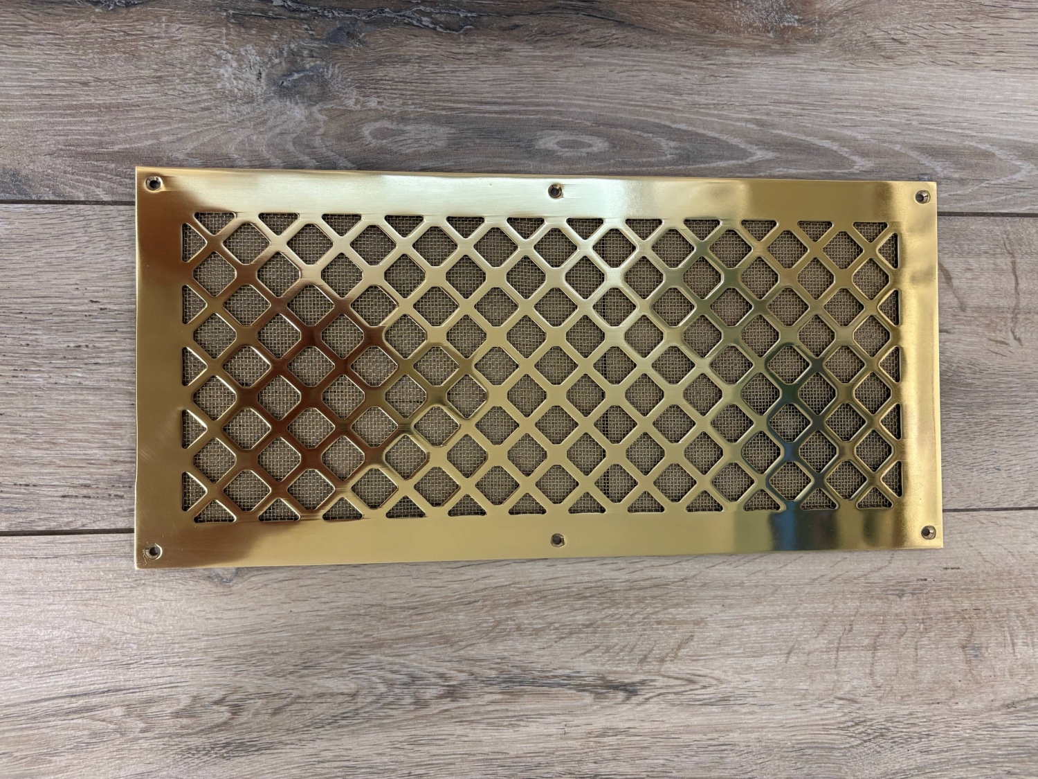 Вентиляционная решётка латунная полированная с сеточкой и шурупами ЛР18 400х200